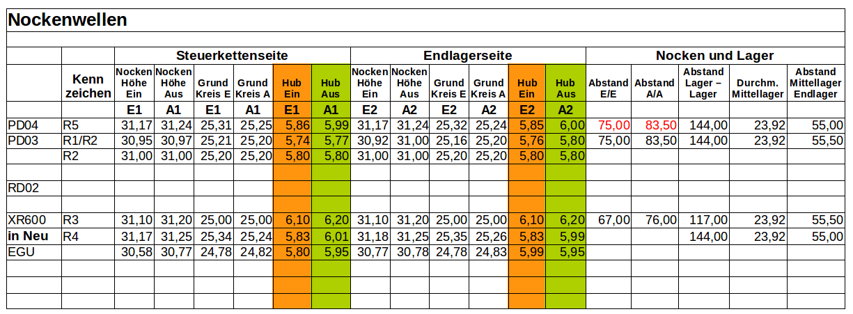 haben. In der Tabelle unten sind die Nockenwellen vermessen.